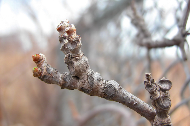 今天早上还有一点细碎的雪花,到下午阳光明亮耀眼,然而气温仍旧低。孤寂秃枝的顶端冒出了新芽。
