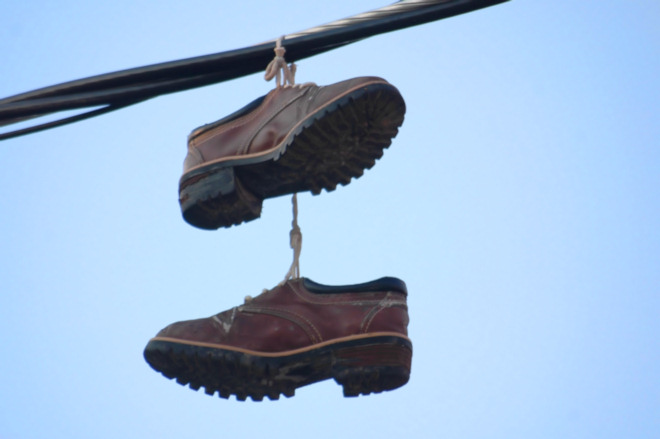 新闻报道说,每年夏天过後,电信工人要花很多功夫清除各个学校附近挂在电线,电话线上的鞋子。