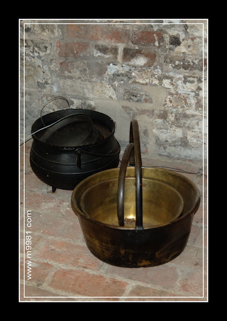 下图铜锅的确做得很好:直到清代中期,很多英国家庭根本就没有厨房,他们在客厅里取暖的壁炉中挂上铜锅或者铁锅,煮东西吃。同时也挂上一块铜质或铁质的平底盘,烤制面包或者面饼。这样的生活方式,也传给了印第安人。