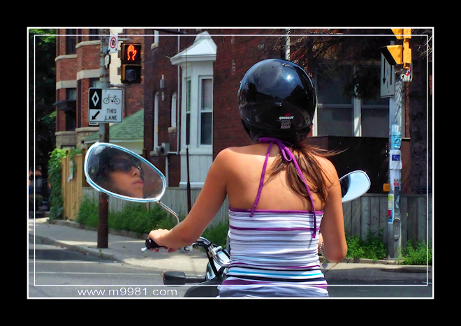 转过了几次弯,这辆摩托车竟然一直在我前面,开得很快。我不可能超过她,只好跟着。最怕红灯时急刹车,如果撞上去可不是闹着玩儿的,会把摩托车撞飞。