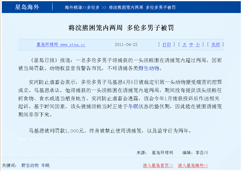 一,今年四月,多伦多一位白人男子没事抓浣熊玩儿,将抓到的浣熊在笼子里关了若干天不给它吃不给它喝。结果受到惩罚: