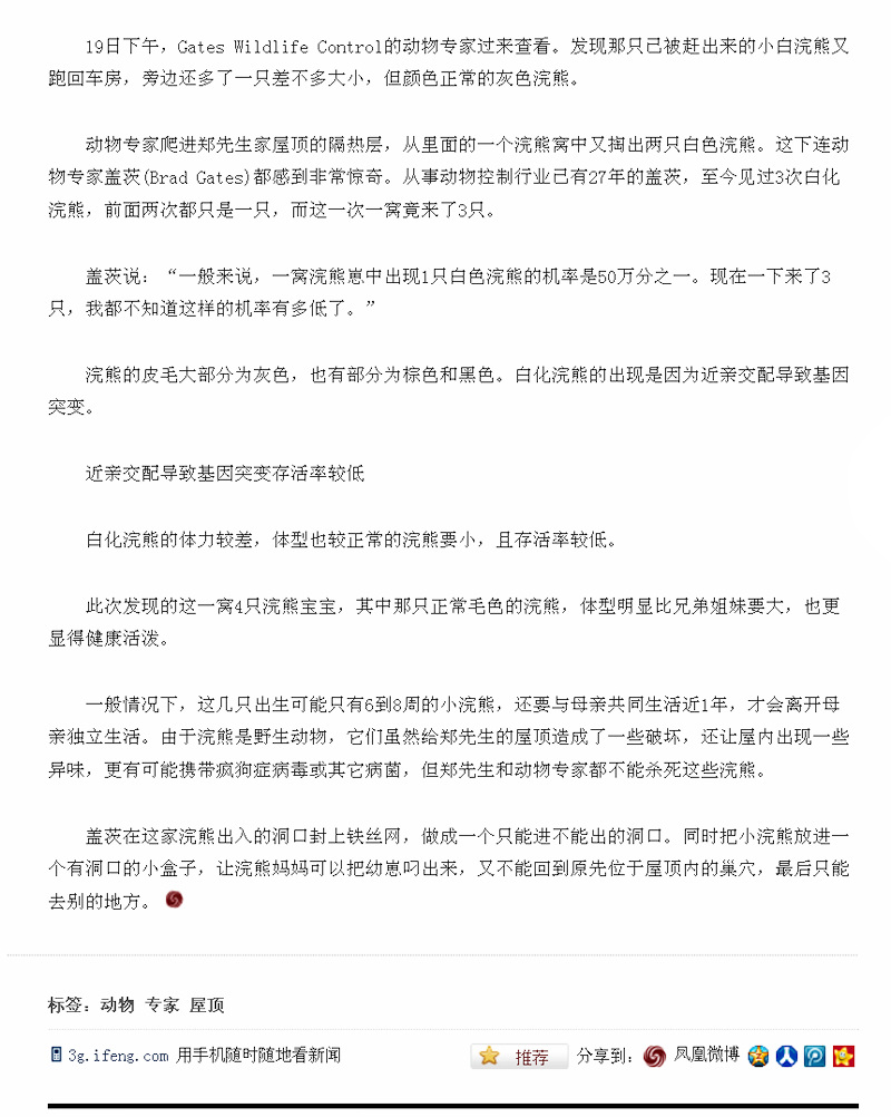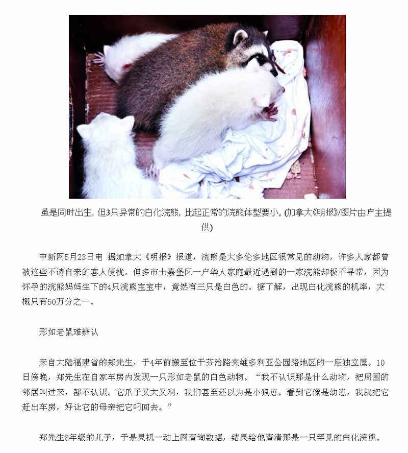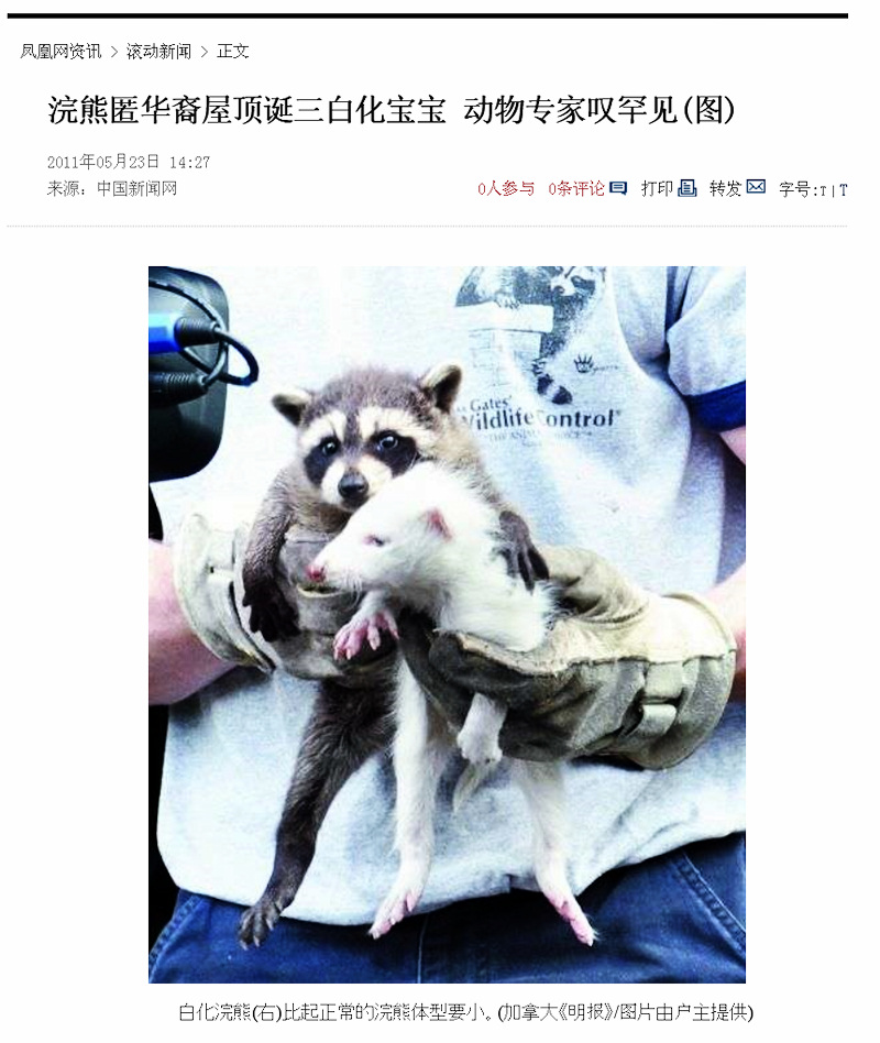 二,今年五月,多伦多一位华人家里发现较少见的白化浣熊: