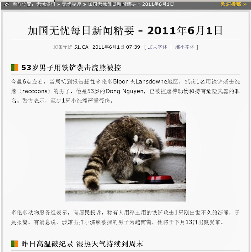 三,今天,六月一号,多伦多一越南裔居民打伤一只小浣熊,被警察抓走,估计也会被重罚。