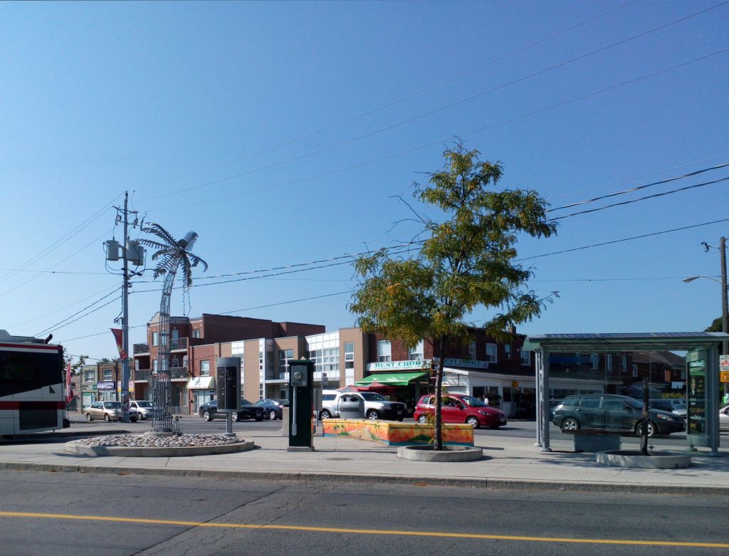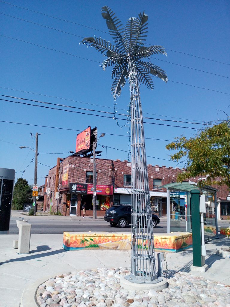 昨天(星期天)从家里去大天才的房子,路上拍的。多伦多一年有大半年天寒地冻的,附近有加勒比人的社区,居然用铁架整了一个棕榈树立在路边: