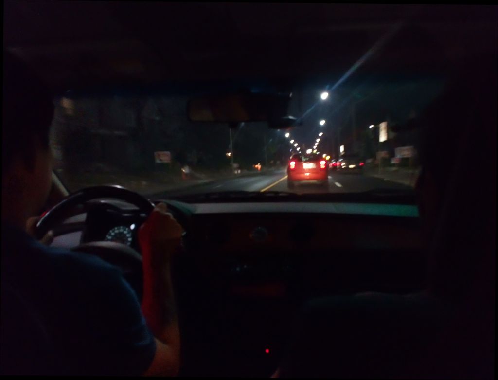 下工回家的路上,已经是8点多钟了。开车的是大天才,右边坐的是木匠婆,我在后座拍了这张平板机照。