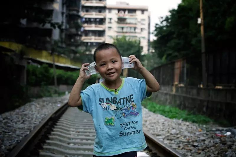 广州郊区,来自海南的孩子独自在铁路上玩耍。