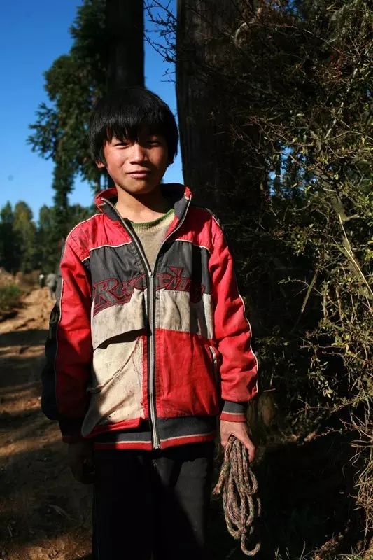 “拿着绳子干嘛?”“上山搂猪草。”“远吗?”“很远,走一趟两小时,一天只能去四趟。”“不用上学吗?”“早不上了!”