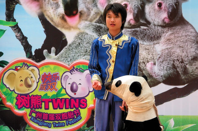 小孩爱看动物,在动物园里举行双胞胎聚会是个不错的主意。牵只黑狗熊来装扮成熊猫也蛮幽默的。只是板着脸的男孩(还是女孩?)就有点煞风景。小青年的文化素质看来比较差。