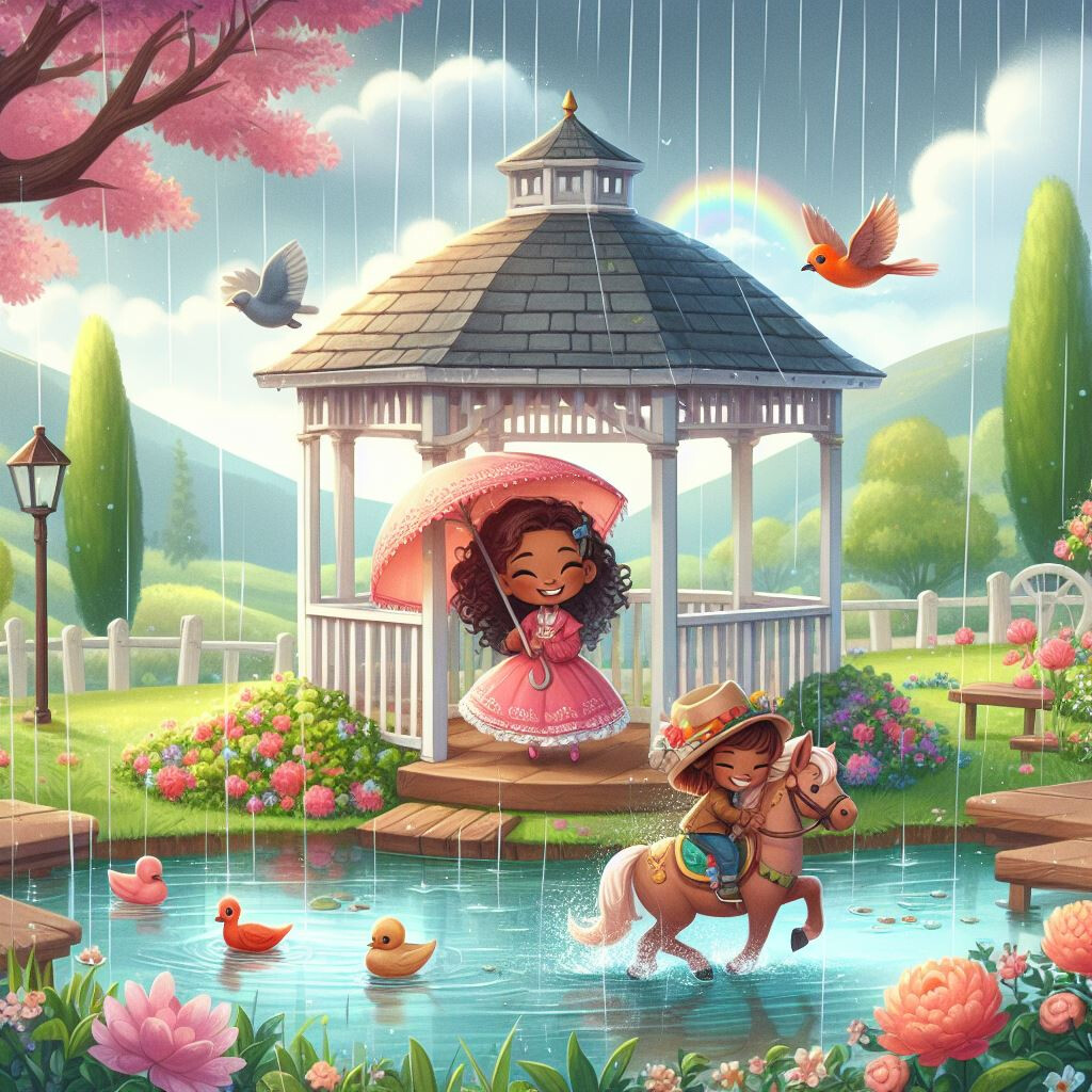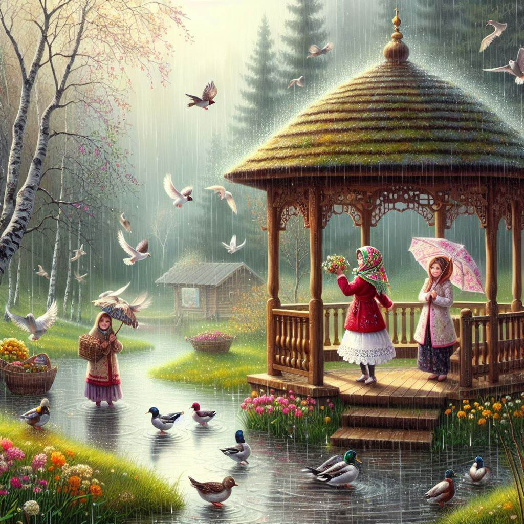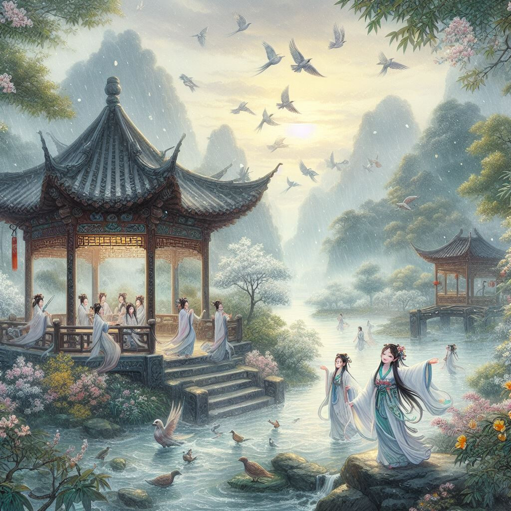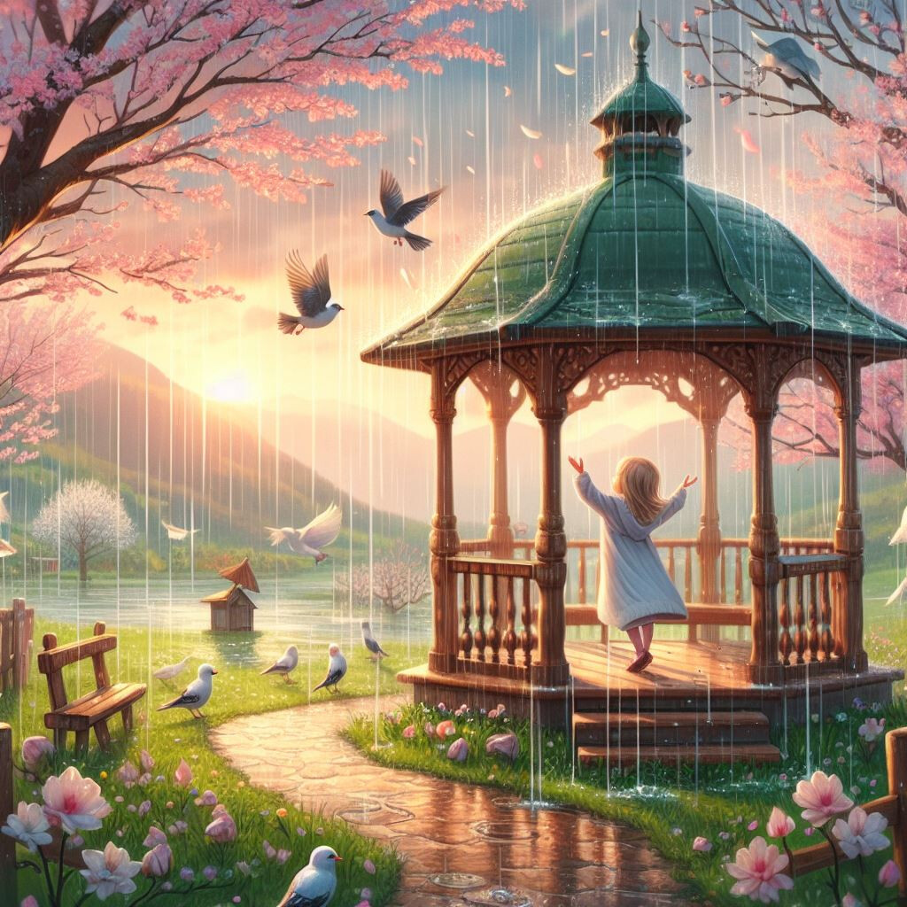 如果把上面诗歌中的词汇单抽出来,做个描述:雨色,春天,凉亭,鸟语,景色,快乐姑娘。