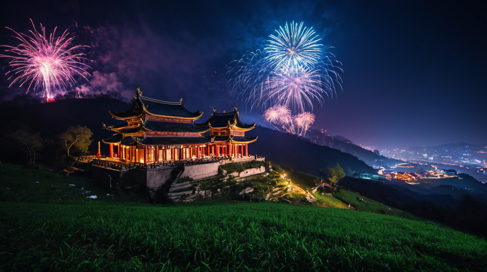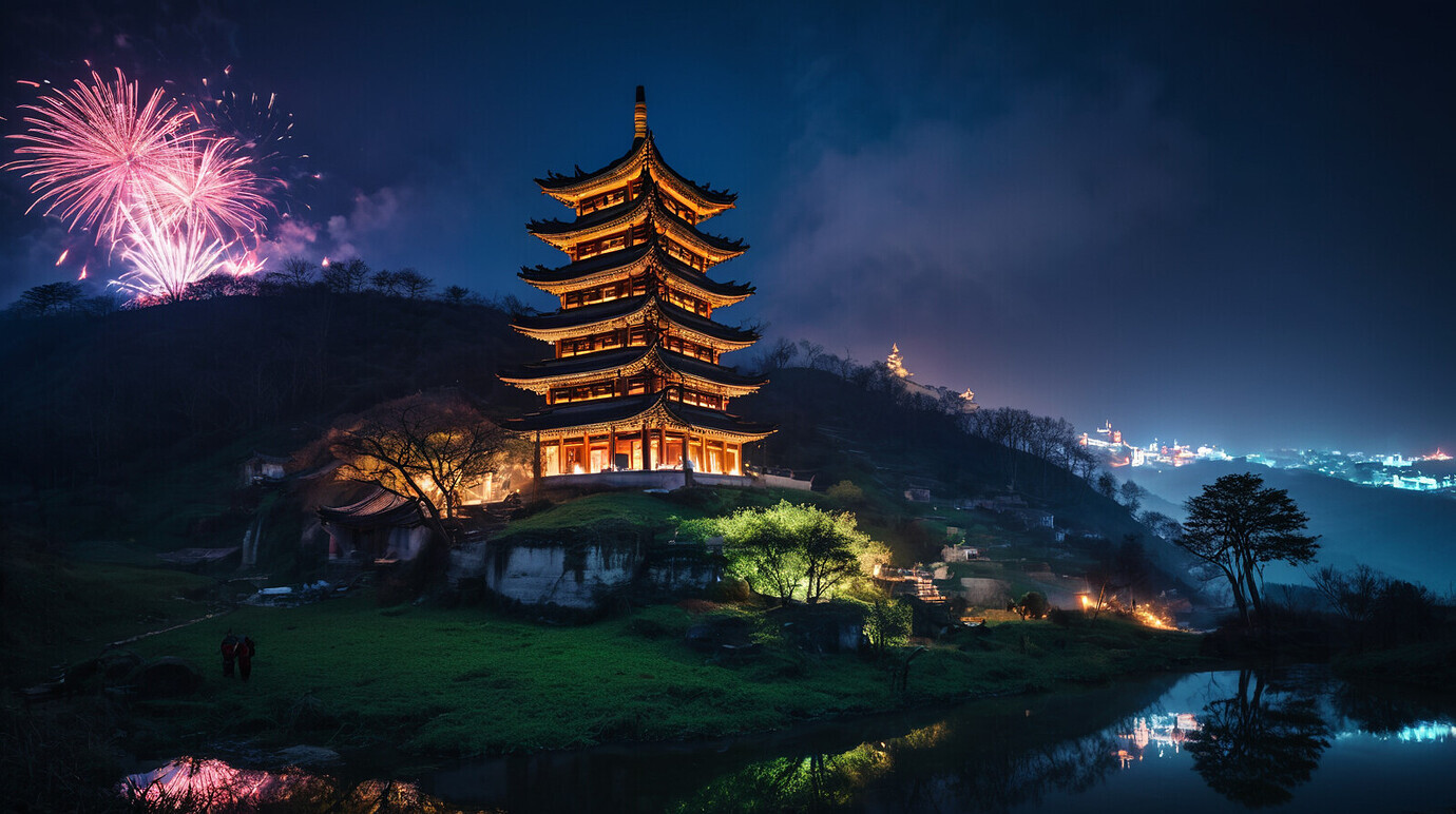 cinematic photo raw of photo,best quality,masterpiece,highres,4k,8k,ancient temple suspended,sinomenine leaning on the root,shilan tongye,fireworks across the hill village,bosheng snow in yuanpu,hanzhou grass marks,fisherman’s song gone,why wulingyuan, . 35mm photograph, film, bokeh, professional, 4k, highly detailed