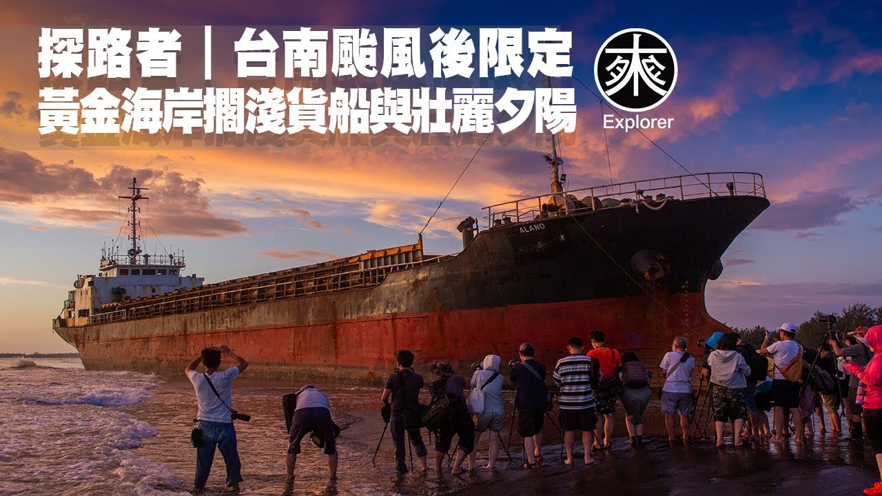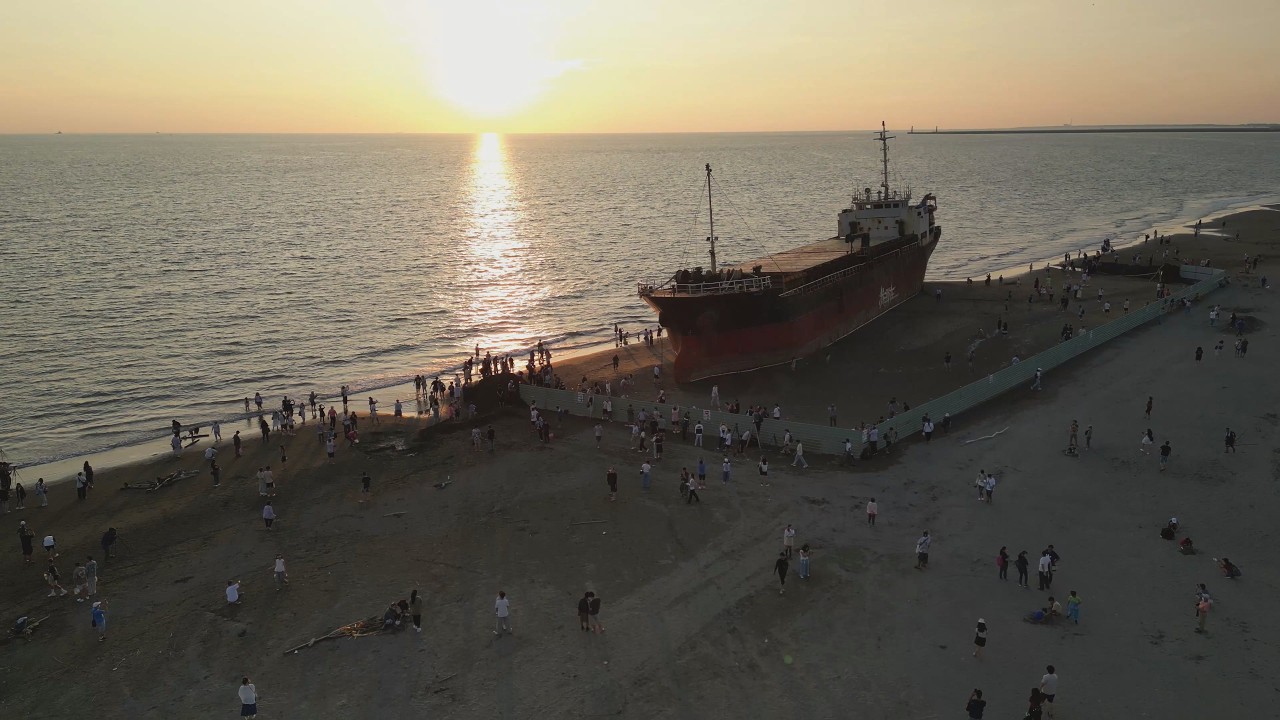 「台南黄金海岸夕阳奇观:搁浅的苏菲亚号美景,捕捉末日之美:货轮在夕阳下的梦幻倒影!