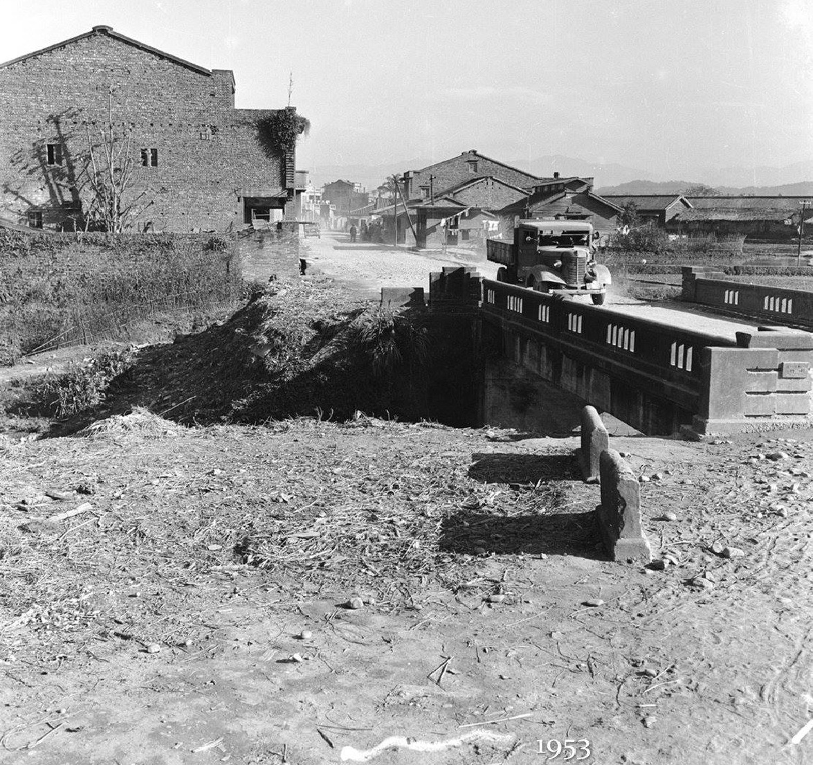 这相片摄于1953年,镜头往南望,画面中的小桥位在今新北市中和区中和路与泰和街口,桥下为中和沟,画面右侧的长条建筑为中和国校(今中和国小)校舍。