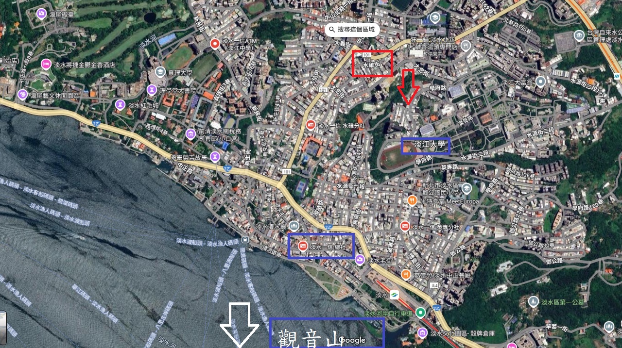 (由淡水区的水碓子北瞰淡水下街,左边树林为当年淡江大学运动场,中间大楼为当年一信合作社)。