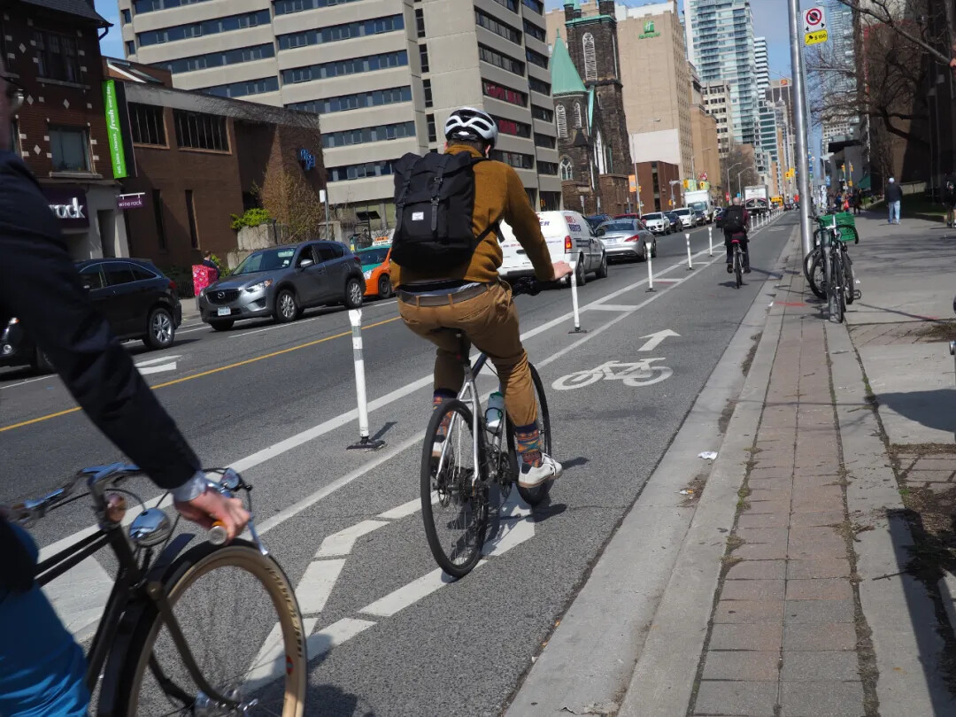 多伦多市中心有很多街道都规划有自行车道,电动滑板在其中相对安全。我家门口的这条街便规划有自行车道。