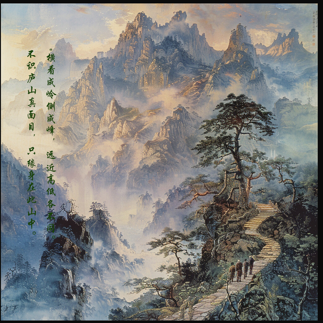 指令用了横看成岭侧成峰,远近高低各不同,不识庐山真面目,只缘身在此山中。