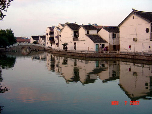 倒影裡頭有房子的全影 , 有藍天白雲 , 構圖不錯 .
